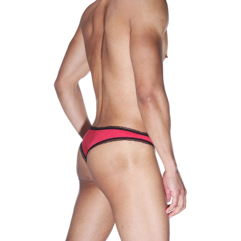 Красные мужские трусы-бразилиана с черной рюшевой отделкой.