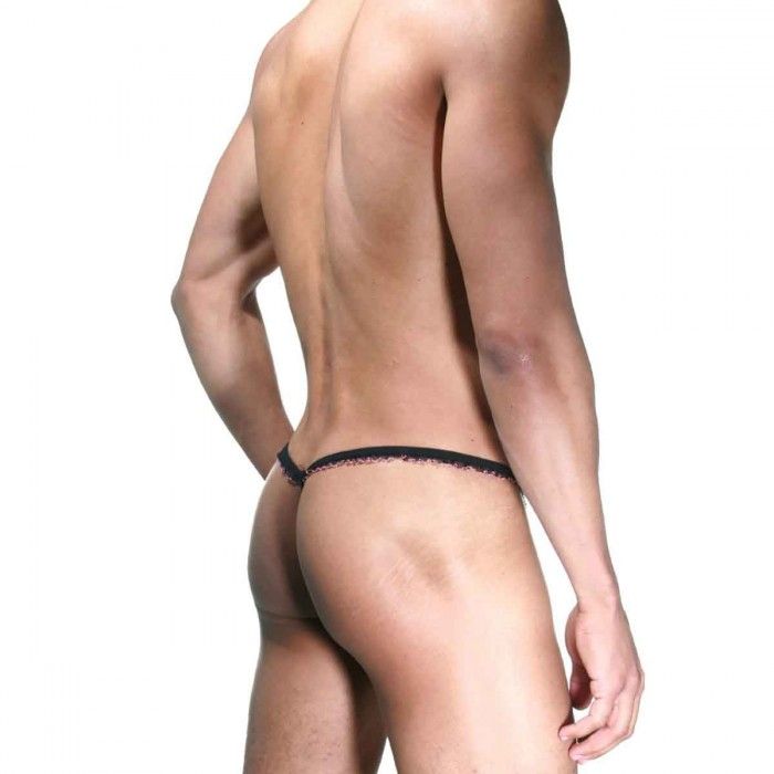 Розово-черные трусы-стринги с рюшей.