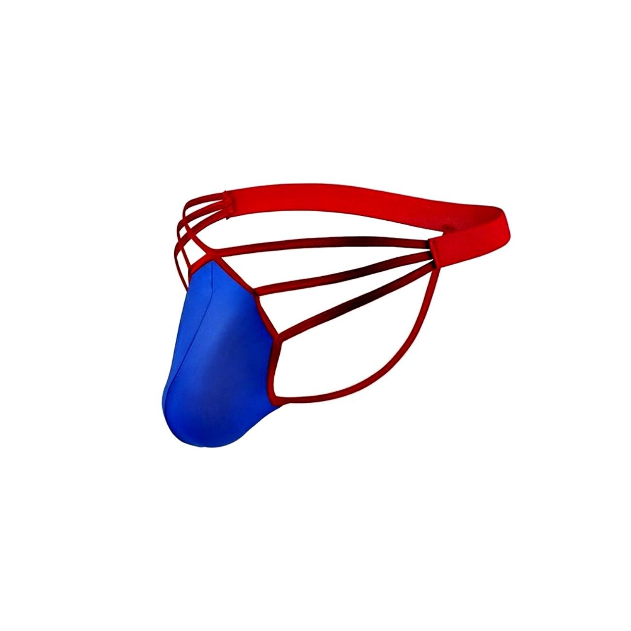 Синие сексуальные трусы-стринги на тонких красных бретелях.