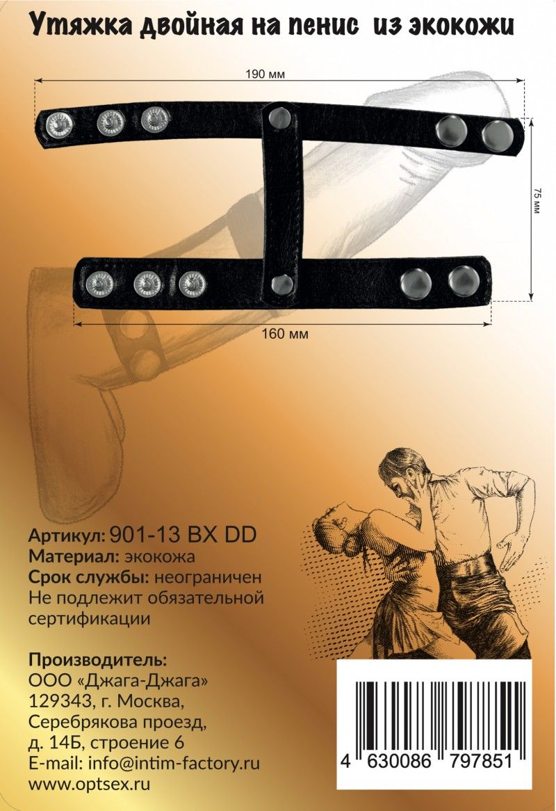 Двойная утяжка из экокожи. Крепится на основание пениса и обеспечивает надежную фиксацию, предотвращая тем самым преждевременную эякуляцию. Преимущество данной модели в том, что каждое из колец регулируется по размеру. Помимо этого, необыкновенно и невероятно сексуально смотрится на теле. Силу сжатия можно регулировать кнопками, диаметр от 5,7 - 4,5 см. Длина дополнительных колец - 16 см., ширина - 7,5 см. Минимальный диаметр - 4,5 см.