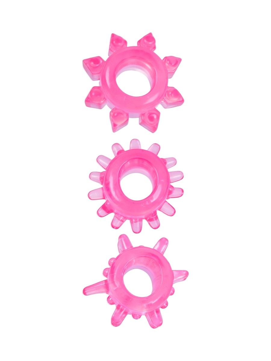 Эрекционное кольцо обеспечит продолжительную эрекцию и поможет продлить интимную близость. «Отростки» на внешней поверхности секс-игрушки будут стимулировать интимные зоны партнёрши. Эрекционное кольцо хорошо тянется. Изготовлено из приятного на ощупь материала. Просто в использовании и уходе. В наборе 3 эрекционных кольца с различным рельефом.