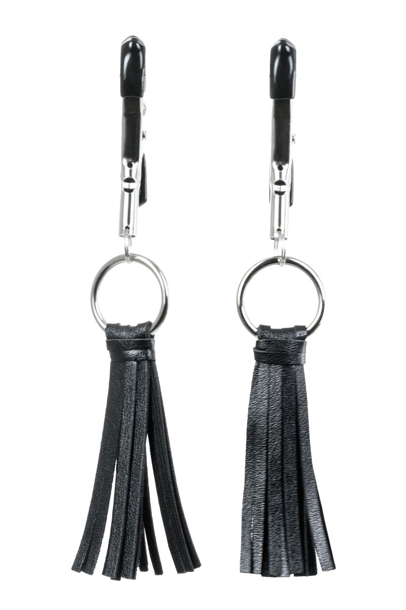 Зажимы классической формы украшены кисточками из PU- кожи. Они не только стимулируют соски, но и придают игривый вид. Сдавливание регулируется болтиком и может быть усилено или уменьшено во время интимной игры. Покрытие на концах зажимов защищает нежную кожу.