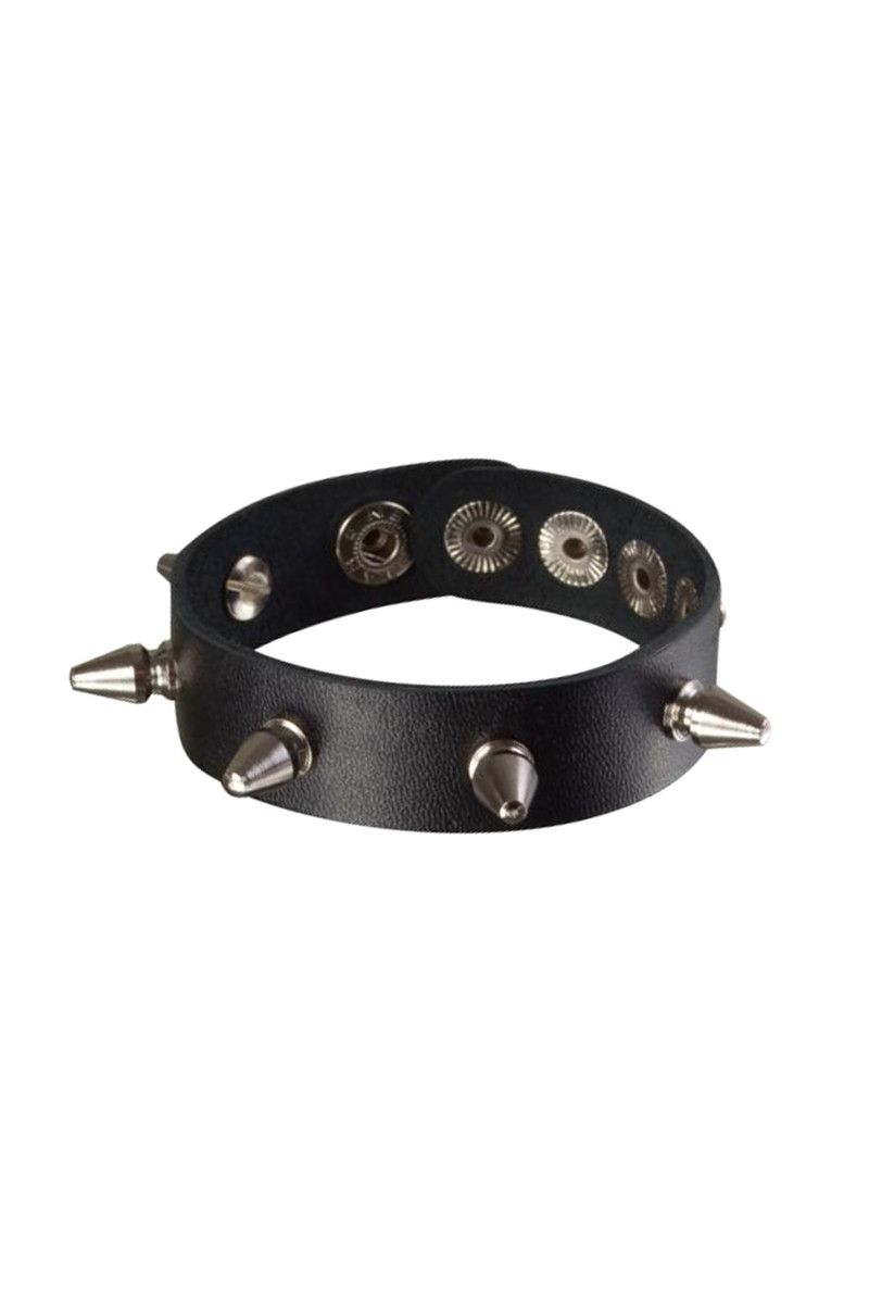 Узкий браслет из плотной натуральной высококачественной кожи черного цвета, украшенный пятью серебристыми металлическими шипами, не только является атрибутом для эротических ролевых игр и практик БДСМ, но и стильным украшением для ношения. Ширина - 2 см.